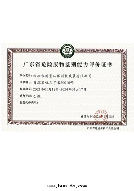 廣東(dōng)省(shěng)危險廢物(wù)鑒别能(néng)力評價資質(zhì)乙級證书